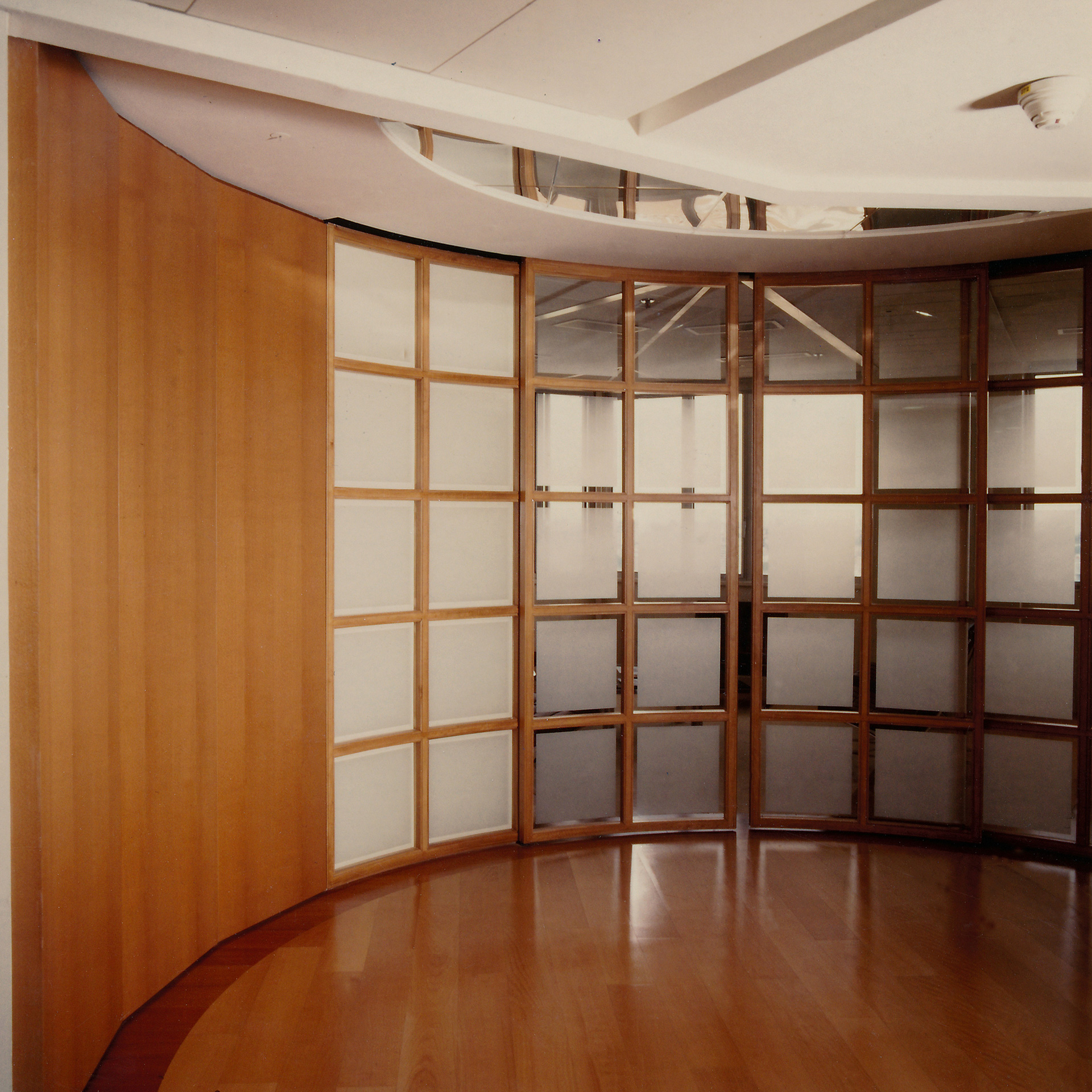 La hauteur sous plafond n’étant pas très importante, dès l’entrée, les portes coulissantes courbes en bois et verre biseauté du hall d’accueil se reflètent dans un plafond de miroirs, comme deux stèles à l’allure imposante. Les portes d’accès au bureau présidentiel s’ouvrent jusqu’au plafond pour donner une impression de grandeur à l’espace. Tout contribue à faire de ce lieu un espace privilégié du raffinement et du pouvoir.